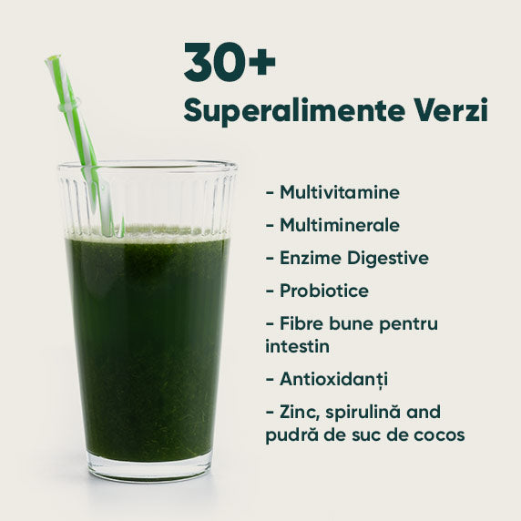 Peste 30 de superalimente bogate în nutrienți, de la spirulină și chlorella la kale și broccoli, combinate cu vitamine și minerale esențiale pentru a susține metabolismul și a ajuta la menținerea apărării naturale - totul natural, fără zahăr adăugat.